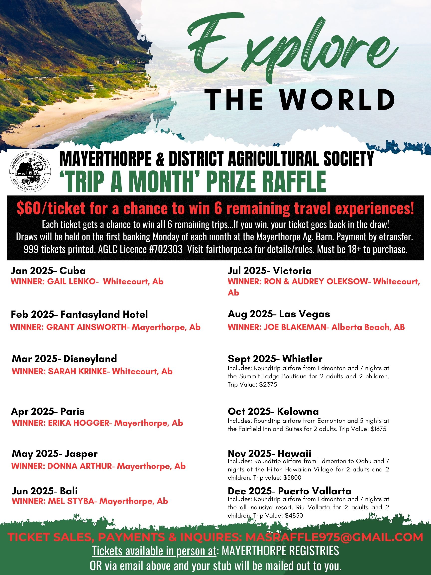 Draws will be held on the first banking Monday of each month at the Mayerthorpe Ag Barn in Mayerthorpe, Alberta.